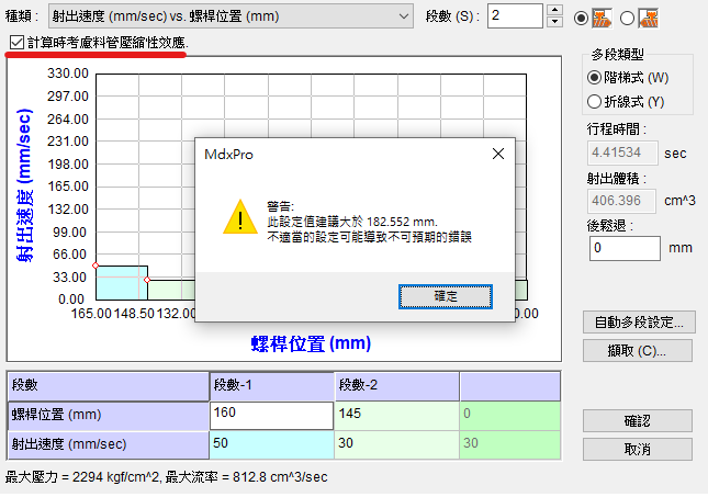 但實際位置設定160mm,保壓殘量位置在5.5mm,如下圖