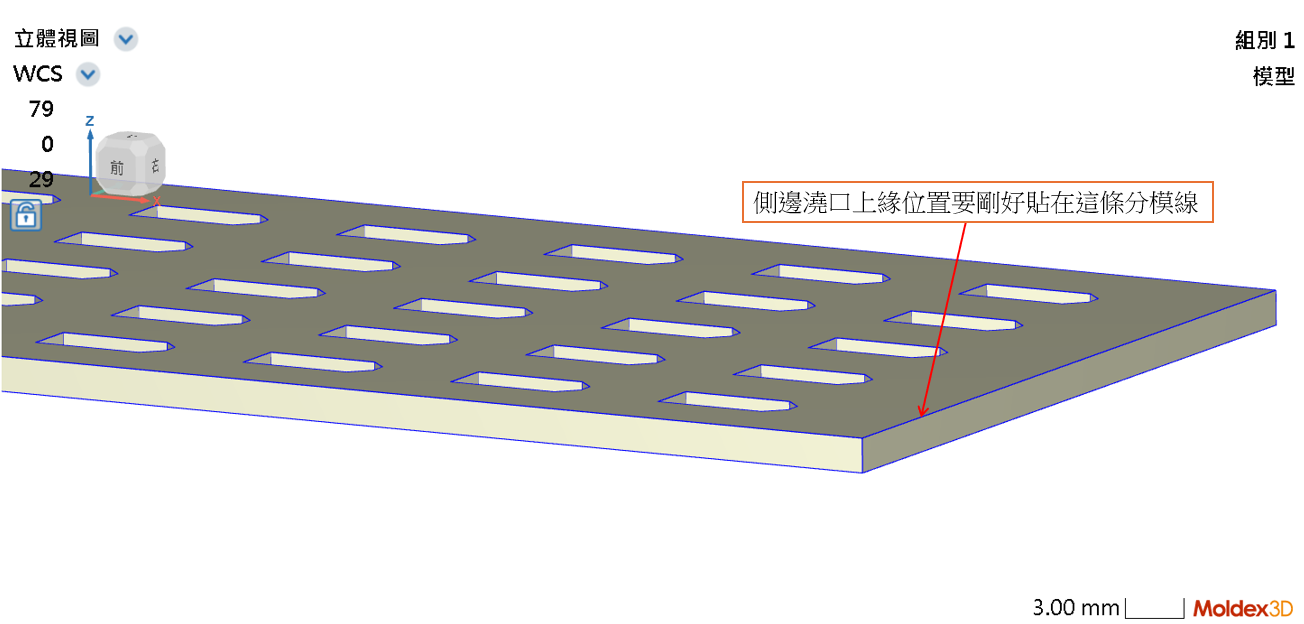 因為模具設計的關係,我想要設定側邊澆口位置要剛好貼在分模線,如下圖,請問要怎麼設定?
